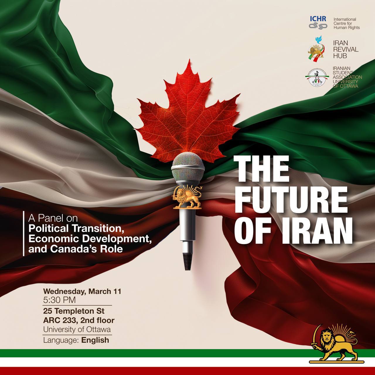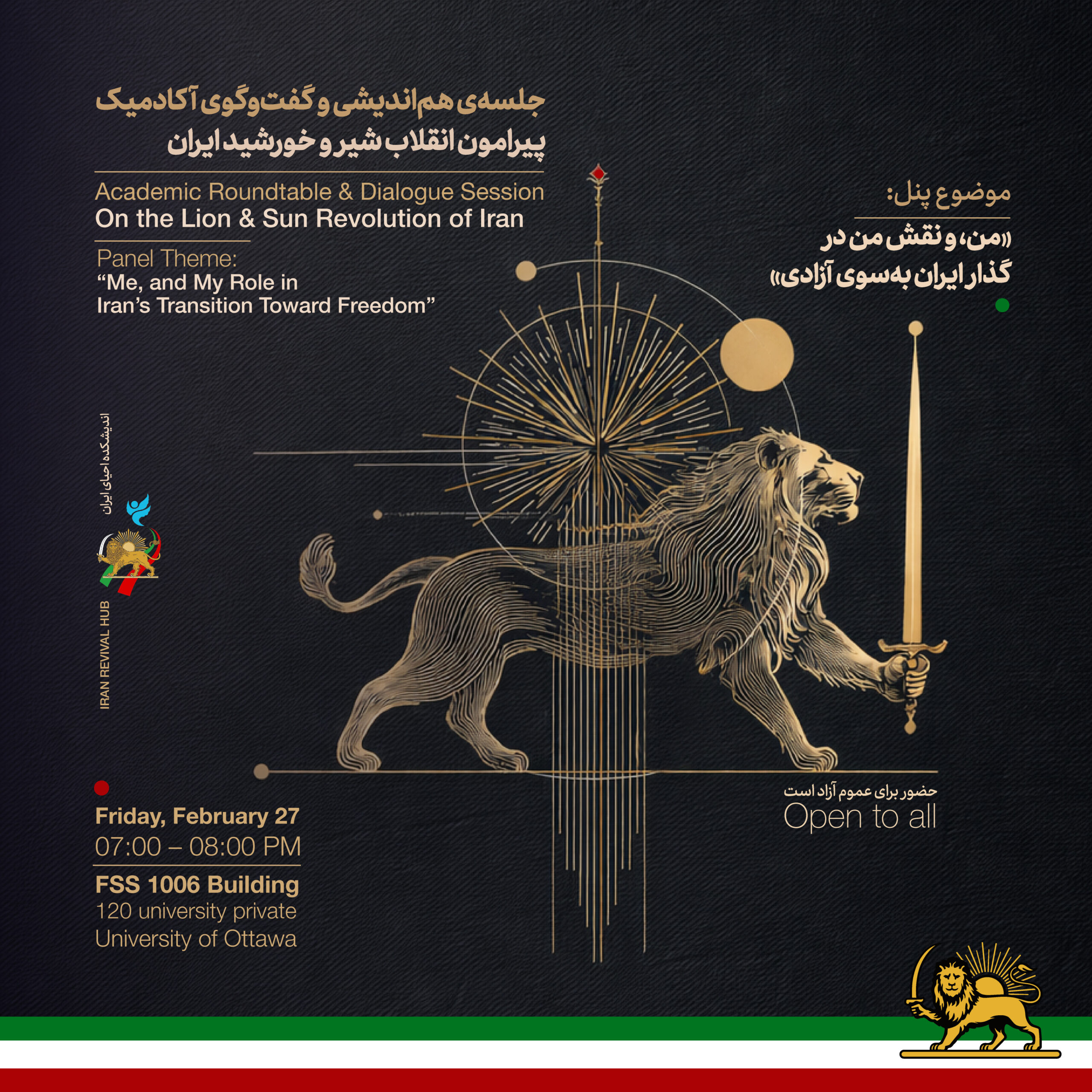University of Ottawa 120 University Private, Ottawaجلسهی هماندیشی و گفتوگوی آکادمیک پیرامون انقلاب شیر و خورشید ایران موضوع پنل: «من، و نقش من در گذار ایران بسوی آزادی» اندیشکده احیای ایران حضور برای عموم آزاد است جمعه:۲۷ فوریه. ساعت ۷ تا ۸ بعدازظهر Theme: “Me, and My Role in Iran’s Transition Toward Freedom” Friday, February 27 07:00 –…